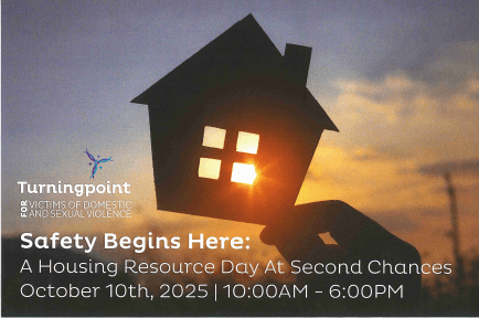 On Friday, October 10--World Homelessness Awareness Day and Domestic Violence Awareness Month--a Turningpoint advocate will be available on site at Second Chances to schedule housing assessments and connect unhoused persons with resources. Individuals who participate in an assessment will be offered a hygiene bag and a gift card to Turningpoint's Second Chances Thrift Store.